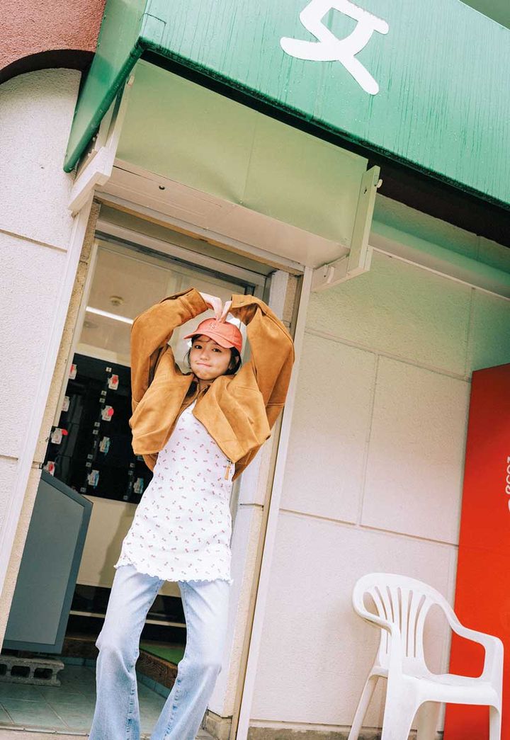 大原優乃。ar3月号より ジャケット¥18,700、デニム¥18,480、ローファー¥15,180/マウジー(バロックジャパンリミテッド) トップス¥7,700、キャミワンピース¥16,500/ザヴァージンズ キャップ¥5,500/リーバイス(リーバイ・ストラウスジャパン) ソックス/スタイリスト私物