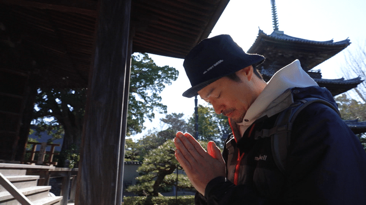 春の晴天に恵まれ、川越しに遠く聳えるのは真妻山、別名「日高富士」。その名のとおり美しい山容が地元民の誇りとなっている山です。前川さん、登山口へ向かう前に麓の日高川町に寄り道。和歌山県内に現存する最古のお寺「道成寺」で登山の安全を祈願します。