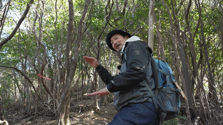 「真妻山、標高523mですよね?入り口で『2kmちょいか、思ったより短いじゃん』って思ったんですけど、、、」そう、距離が短くて標高差があるということは、その分だけ急勾配が続くんですよね。「距離が短いことを喜んじゃいけなかったんだぁ」と苦笑まじりにロープを手繰り鎖場を登り切ると木々の間を抜ける気持ちの良い尾根道に出ます。木漏れ日の下を抜ける一陣の風に春の気配を感じた前川さん。まもなく山頂ですよ。