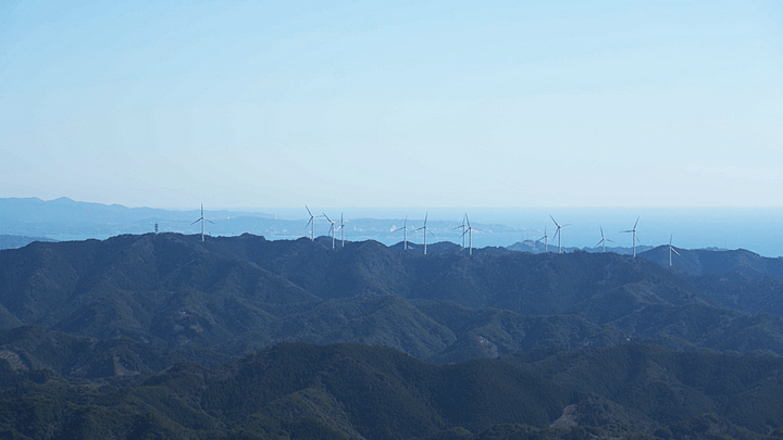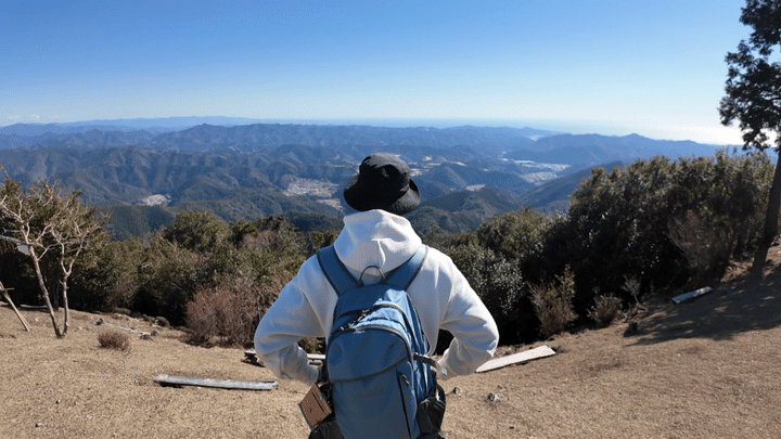 ようやく標高523mの真妻山の山頂に到着。そこにはグルッと一周360度を見渡せる絶景が待ち受けていました。手前の山並み越しに海岸線がはっきりと眺められ、有名な白浜海岸の向こうには紀伊水道、そして太平洋が広がっています。山も海も自慢の和歌山県の面目躍如といったところでしょう!