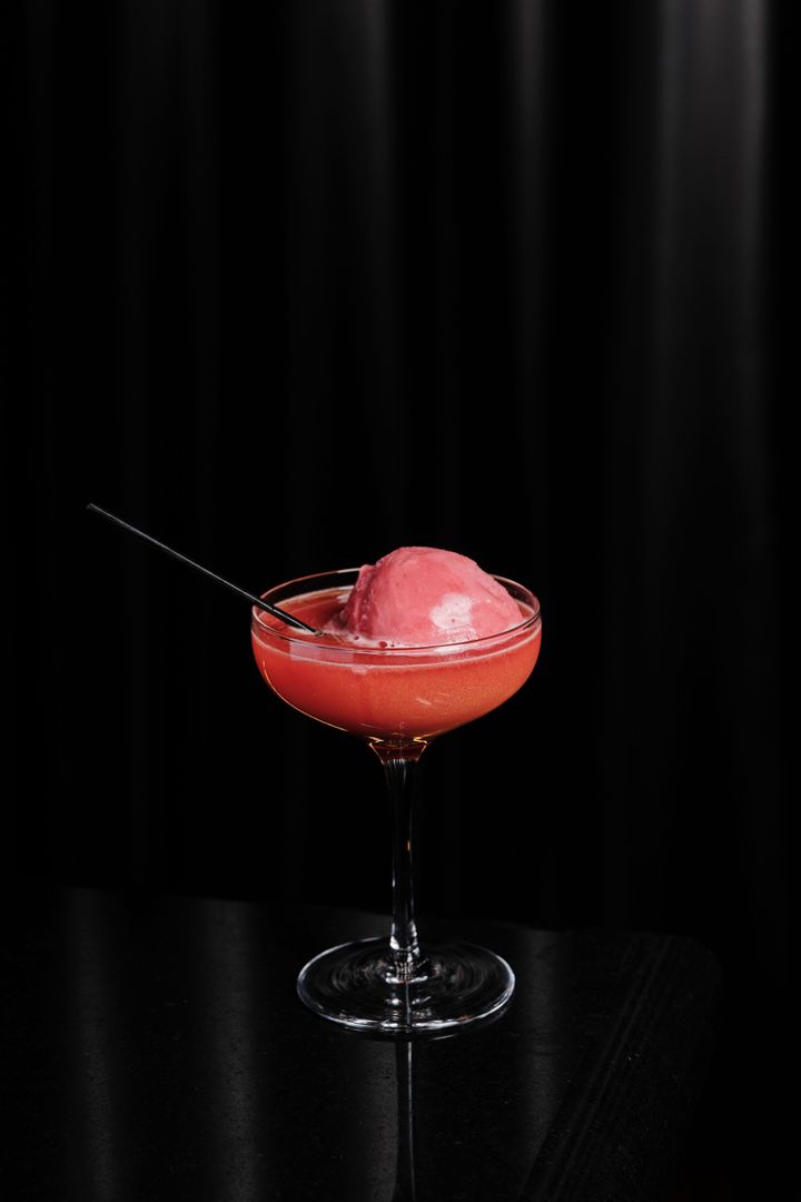 「もしも、愛に形があったなら?」と問いかけるロマンティックなカクテル「星が降り注ぐほどのキス」は、桜やローズ、ラズベリーをスパークリングワインと合わせた華やかな一杯。グラスの中でソルベが溶けていき、時間の経過と共に味わいの変化を楽しめます。