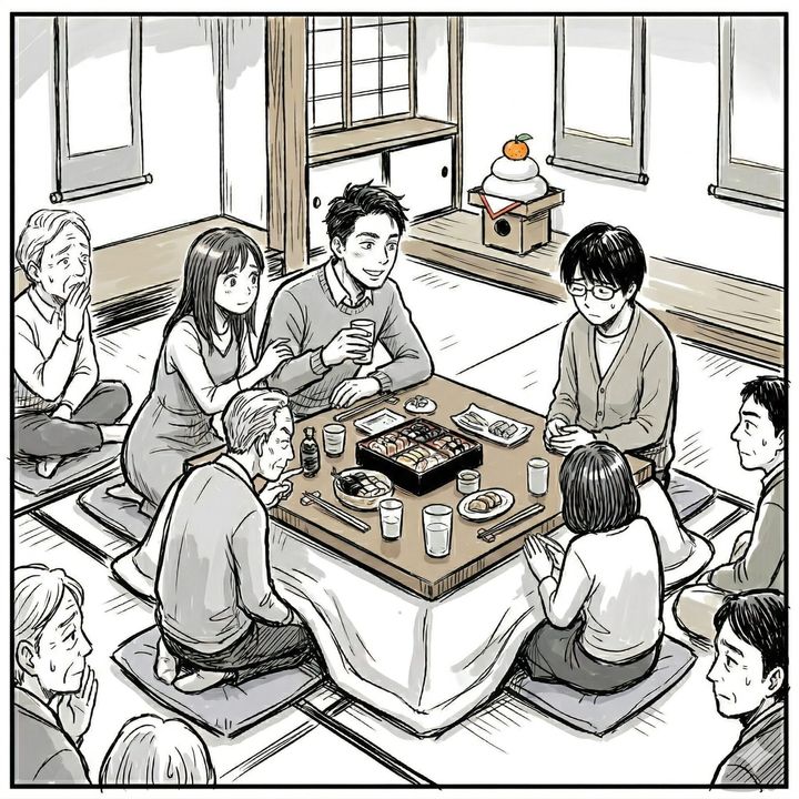 一瞬ヒヤッとする場面もありましたが、いとこの熱意ある研究の話と、新婚である姉夫婦の微笑ましい姿のおかげで、再び和やかなお正月ムードへと戻っていったのです。