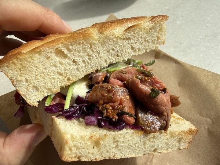 このフォカッチャサンド、写真では大きさが伝わらないと思いますが余裕で2人分の大きさ。そしてこんなに入れて大丈夫?というくらいローストビーフがてんこ盛りで入ってます。