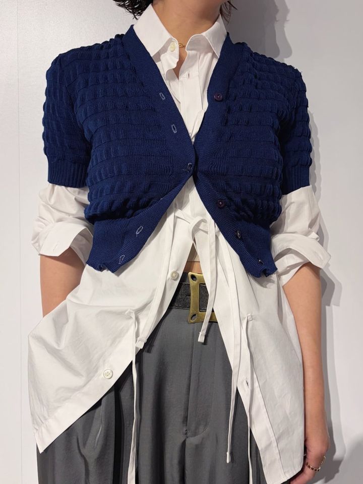 あえてコンパクトカーデを合わせモダンな“レイヤードコーデ”に
