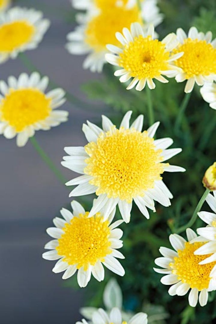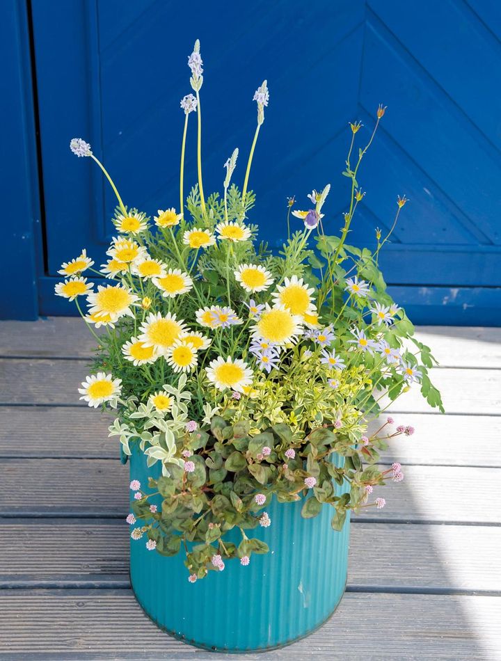 春花の代表で可憐な花を咲かせるマーガレット。一重咲きの白花が知られていますが、実は花色や花形も豊富なので、ぜひ寄せ植えでも楽しんでみて。一株でも印象的なマーガレットは、スッと茎が長く伸びるレースラベンダー、ブルーデイジー、コロコロと丸い花がしだれて咲くヒメツルソバなどを合わせて、個性的で元気なひと鉢に。
