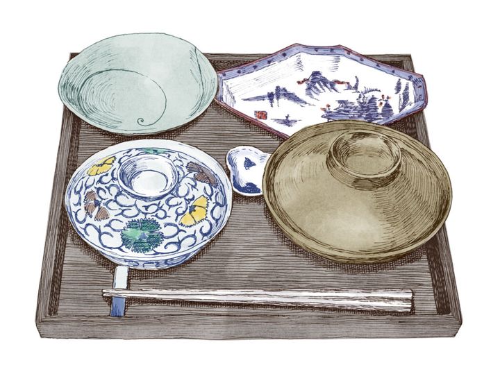 ご飯と汁物に3種の惣菜を添える一汁三菜は、昔は銘々のお膳で供されたことの名残から、折敷にしつらえるのがしっくりくるという浜裕子さん。「現代ではテーブルで和食を食べるのが当たり前ですが、漆盆やランチョンマットを使って1人分のスペースをつくると、配置しやすく、食卓がすっきりと整います」。折敷の手前に箸、左に飯碗、右に汁椀を置き、右上に主菜(肉、魚など)、左上に副菜(煮物など)、中央に副々菜(和え物など)の器を並べる。「日本には古くから『左は右に対して上位』という考え方があり、作物の中で最も尊いお米は汁物の左に置くのです」。食事が始まったら、汁物、ご飯をひと口食べてから、おかずに手をつけるのがマナー。
