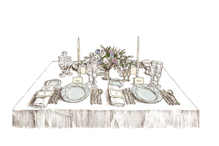 晩餐会などのフォーマルなテーブルでは、以前は前菜からデザートまでシリーズで揃えるのがステータスだった。クロスは白の麻ダマスク織でナプキンと共布に。席を示す位置皿が置かれ、美しい皿で歓待を表し、食事が始まると皿はひかれる。カトラリー、グラスは使う順に外側から並べ、中央には花もしくは置物といったセンターピースが不可欠。会話のきっかけにもなりホストのセンスが問われるアイテムだ。主客の前にソルト&ペッパーが置かれるのは、その昔、塩胡椒が貴重だったため、高価なものを用意してもてなした名残。「フォーマルな席で会話をリードするのは、主にホストの奥様。彼女がナプキンを膝に広げたら食事がスタートする合図です」