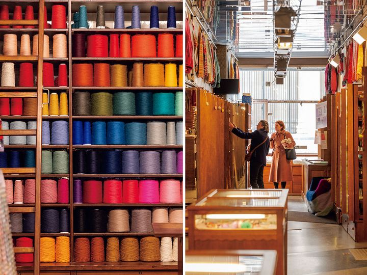 左:様々な毛糸は、ナントの南東ショレ地方にある、19世紀の建物を用いた自社工場で製造されている。 右:フランス国内の主要都市に10店舗を展開。子供からシニアまで幅広い世代の手芸ファンが集まる。