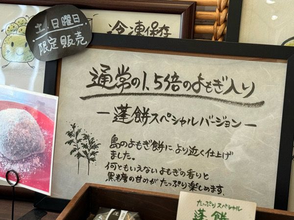 店主は鹿児島県・徳之島出身。島で親しまれてきた、餡子の入っていないよもぎ餅の味を忘れられず、「あの味をもう一度」と自ら作り始められたのがこのお店の始まりだそうです。