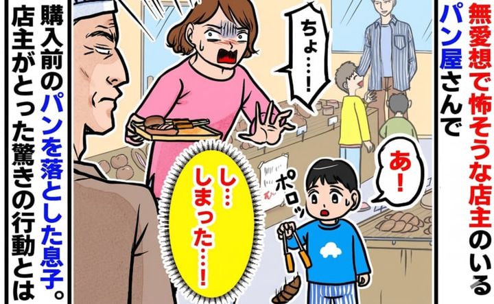 私の家の近くには老舗のパン屋さんがあります。おいしくて子どもたちも好きなのでよく買いに行くのですが、私は、少し頑固そうで不愛想な店主の男性が苦手でした。すると、目を離した隙に、2歳の息子が商品であるパンを棚から落としてしまったのです――。