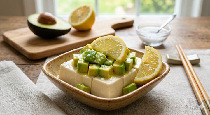 豆腐に角切りにしたアボカドを乗せ、レモン汁と塩をかけて完成。アボカドの良質な脂質が加わることで、腹持ちがグンとUPする。レモンでさっぱりと食べられる。