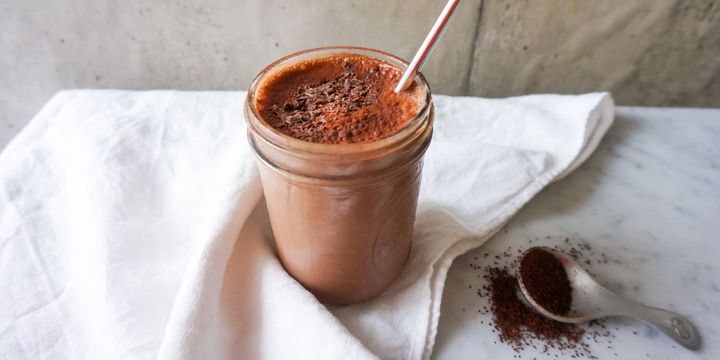 グラスに注ぎ、ダークカカオチョコを刻んで上にトッピングする。