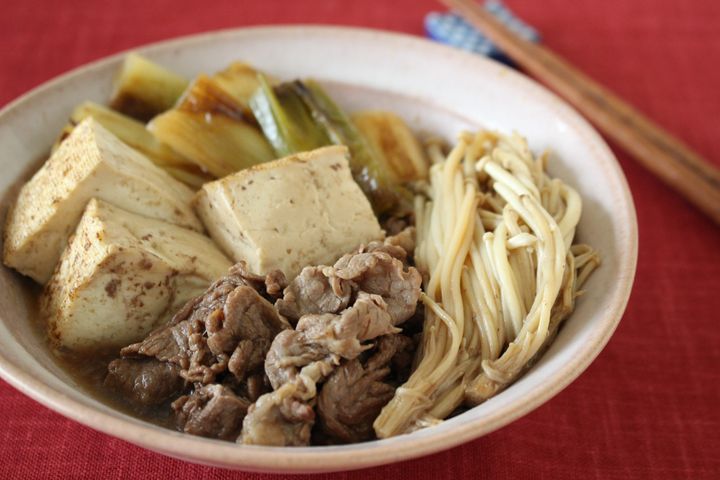 ②鍋に油を入れて中火にかけ、牛肉と長ねぎを焼く。肉に火が通り、長ねぎに焼き色が付いたら(A)と焼き豆腐、えのきを入れる。