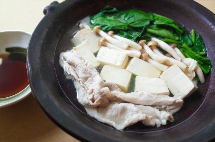 ②鍋に(A)を入れて、しめじと豆腐を入れて煮る。しめじの火が通ってきたら、ほうれん草を加え、豚肉を加える。