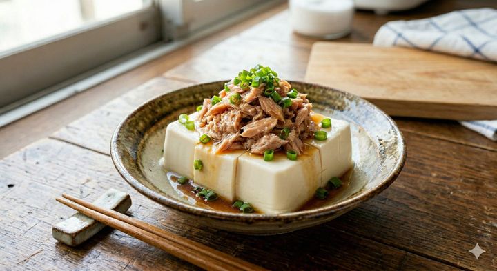 水気を切ったツナの水煮を豆腐に乗せる。めんつゆをかけ、小ねぎを散らす。ツナ缶を乗せるだけで高たんぱくメニューが即完成。調理する気力がない忙しい日の救世主だ。
