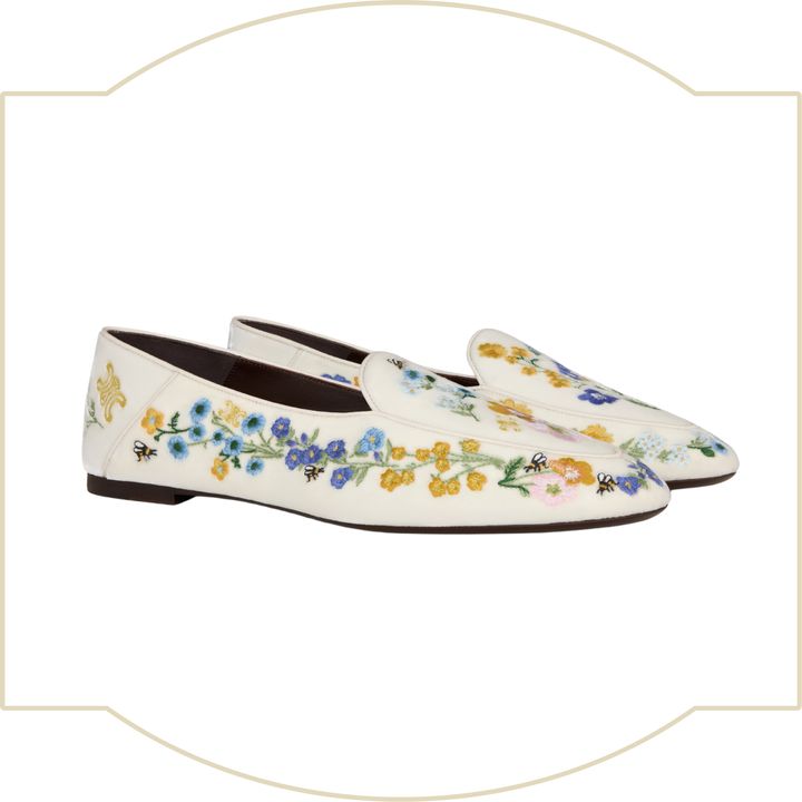 上質なベルベットに、左右で異なる表情を見せるフラワー、ミツバチ、そしてトリオンフの刺しゅうをぜいたくにあしらったローファーは、ロマンチックで遊び心あふれるたたずまいが魅力。アーモンドトゥのなめらかでスリムなシルエットが、日常のスタイルに快適さと気品を添えてくれる。