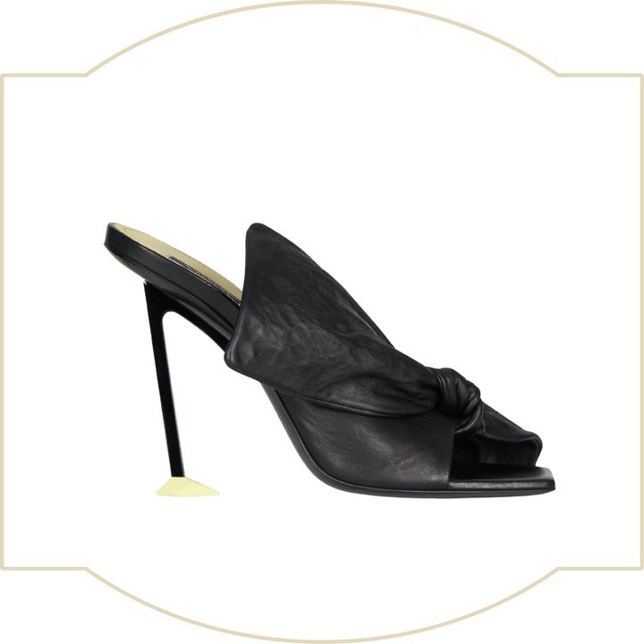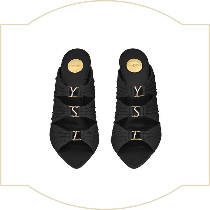 シルクとビスコースによる優雅なギャザーをまとったアッパーに、きらめくラインストーンの“YSL”のカサンドラロゴが際立つミュールは、「サンローラン」らしい研ぎ澄まされた官能性を放つ。11cmのシャープなヒールとアーモンドピープトゥが描く流麗なシルエットで、足元をラグジュアリーかつドラマチックに演出してくれる。
