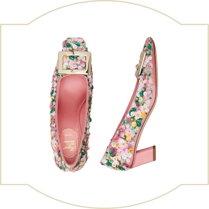 1965年の誕生以来メゾンを象徴する“ベル ヴィヴィエ”を現代的に解釈したラグジュアリーなシューズ。野に咲く花々のようにスパンコールがきらめくサテン地に、アイコニックなバックルとスカイスクレーパーヒールを配することで、タイムレスな魅力と最上級にエレガントな日常を演出してくれる。