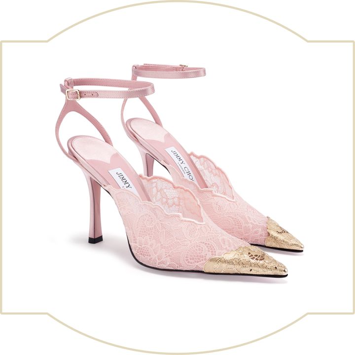 繊細なローズカラーのレースにシアーなフローラルモチーフを重ねたなんとも優美なパンプス。輝くメタルレーストゥキャップのアクセントと細身のアンクルストラップ、10cmのスティレットヒールを添えることで、「ジミー チュウ」らしい華やかさとモダンな強さを兼ね備えている。