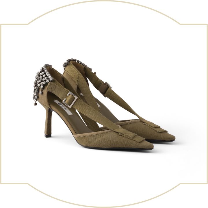 ユーティリティと装飾性、厳格さと華やかさという相反する要素を融合させたパンプスは、1990年代を彷彿(ほうふつ)とさせるフェミニンなシルエットと実用的なキャンバス素材を組み合わせることで、意外性に満ちた美しい調和を描き出す。ヒールには輝くクリスタルがあしらわれ、カジュアルな質感の中にラグジュアリーを添えた唯一無二の魅力を放つ。
