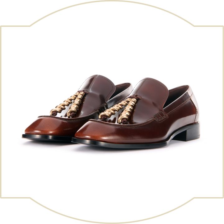 手仕事で磨き上げられたカーフスキンが気品を放つ、伝統的な製法で仕立てたローファーは、ユニークなトゥシェイプとゴールド仕上げのコイル装飾の独創的なアクセントが魅力。歩きやすさに配慮した2cmヒールとラバーを配したレザーソールを備え、クラシックな品格とモダンな感性が美しく調和している。