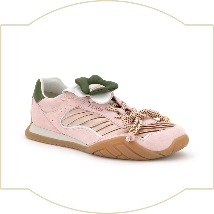 プリーツを施したピンクサテンとスエードの切り替えが躍動感を演出。立体的な花の装飾を配した取り外し可能なシュータンや、“FF”ロゴモチーフとビーズが揺れる装飾的なシューレースが、フェミニンかつエッジィな魅力を放つ。グリーンのレザーが映えるヒールカラーなど、随所にちりばめられたカラフルなディテールも遊び心にあふれている。