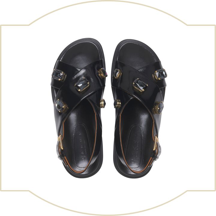 艶やかなレザーで仕立てたアイコニックな“フスベット”サンダルは、調節可能なバックルストラップとクリスクロスデザインの機能美が光る。メタルセッティングの中に手作業であしらわれたきらめく3種のクリスタルとヒールの浮き彫りロゴが華を添え、「マルニ」らしい遊び心を体現している。
