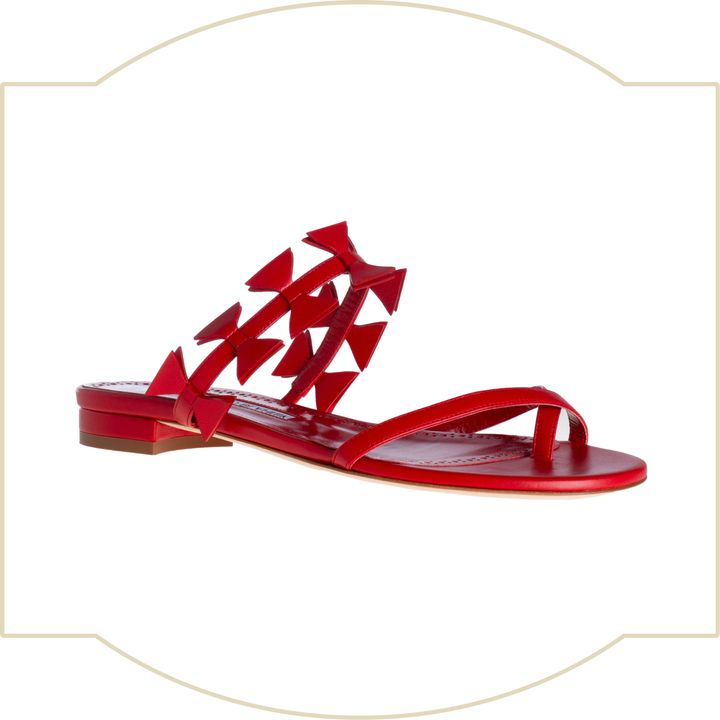 愛らしいレッドのリボンが連なるデザインを、「マノロ ブラニク」らしい上質なレザーときゃしゃなストラップで仕上げたフラットサンダルは、かれんさと洗練されたムードが融合。フラットならではの軽やかな抜け感がありながら、細部に宿るエレガンスが足元を優雅に彩り、日常の装いに華やかなアクセントを添えてくれる。