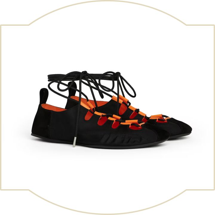 「アライア」の衣服哲学を体現する新作シューズは、ダンスシューズに着想を得たレースアップとフェミニンなオープンヴァンプがしなやかで官能的、そして軽やかなたたずまいを演出する。足の動きに寄り添う折りたたみ可能な二重構造のラバーソールが、柔軟な履き心地をも叶えてくれる。