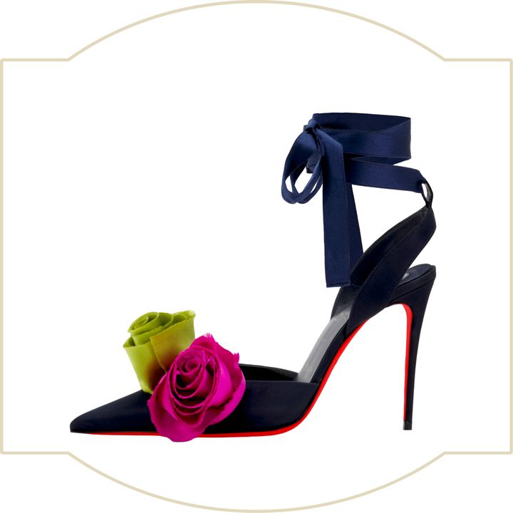 「クリスチャン ルブタン」の美意識を象徴する一足。10cmのスティレットヒールと優雅なリボンタイが描く洗練されたシルエットに、深いラストナイト ブルーのシルクタフタと手作業で縫い付けられた色鮮やかなフラワーモチーフが相まって、まるで“世界にひとつだけのブーケ”をまとうようなリュクスな足元に。
