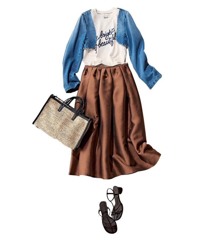 デニムボレロ¥39,600(ピース/ガリャルダガランテ 青山店)ロゴTシャツ¥8,580(ミクスタ フォー ユナイテッドアローズ/ユナイテッドアローズ 渋谷スクランブルスクエア店)スカート¥44,000(ソブ/フィルム)ラフィアバッグ¥60,500(A VACATION/ebure)サンダル¥12,650(ル タロン/ル タロン 有楽町マルイ店)