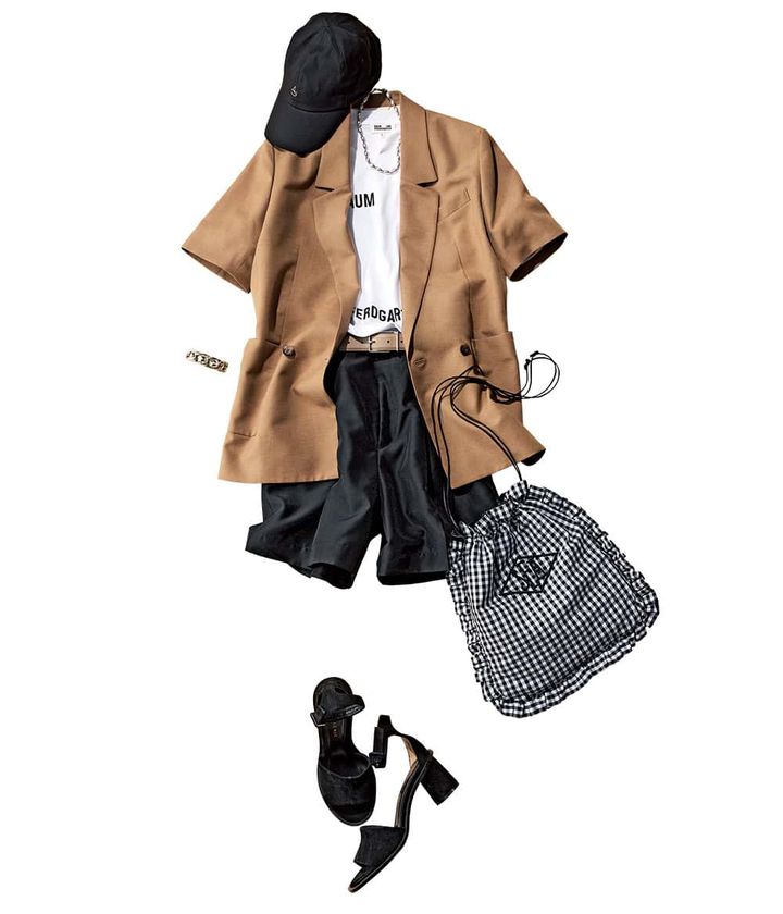 半袖ジャケット¥49,500〈アルアバイル〉ロゴTシャツ¥14,300〈バウム・ウンド・ヘルガーデン〉(ともにアルアバイル)ショートパンツ¥24,200(ツル バイ マリコ オイカワ)キャップ¥9,680(ルーニィ)ベルト¥26,400(MAISON BOINET/GALERIE VIE Marunouchi)ギンガムチェック巾着バッグ¥22,000(SEA/エスストア)スエードサンダル¥39,600(ピッピシック/ベイジュ)ネックレス¥15,750(アビステ)