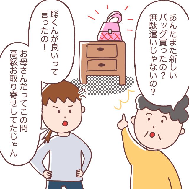 「あんた、また新しいバッグ買ったの?無駄遣いじゃないの?」珍しく妻に鋭い指摘をする義母。そう言われてすぐに腹を立てた妻は、「聡くんが良いって言ったの!お母さんだって、この間高級お取り寄せしてたじゃん」と即反論。
