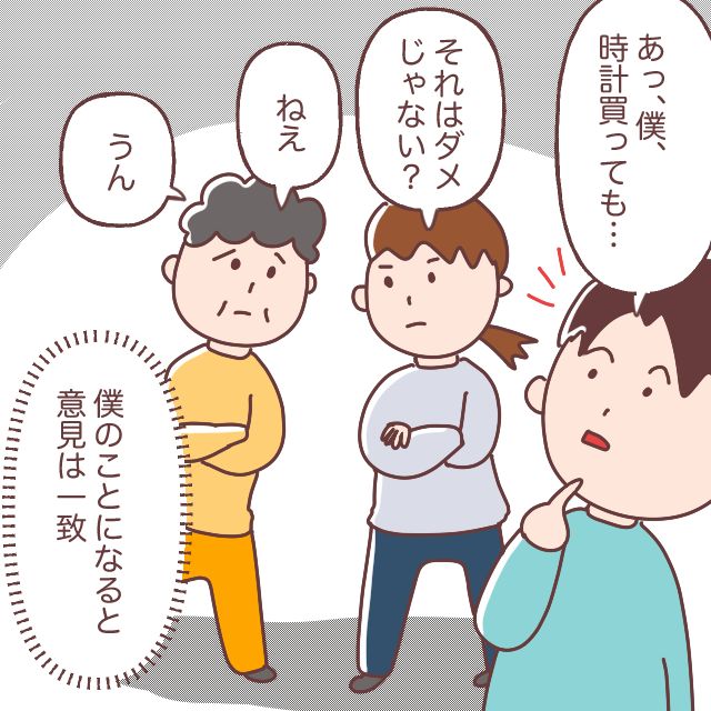 その後、「あっ、僕、時計買っても・・」と言うと、「それはダメじゃない?」「ねえ、うん」とケンカにもならず2人して即答。いつもは意見が食い違う2人だけど、僕のことになると意見は一致するようです。