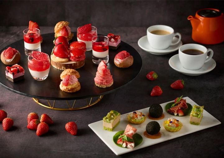 ケーキやマカロンなど、いちごを主役にしたスイーツがずらり。ひと口ごとに春の甘さを感じられるラインナップ。