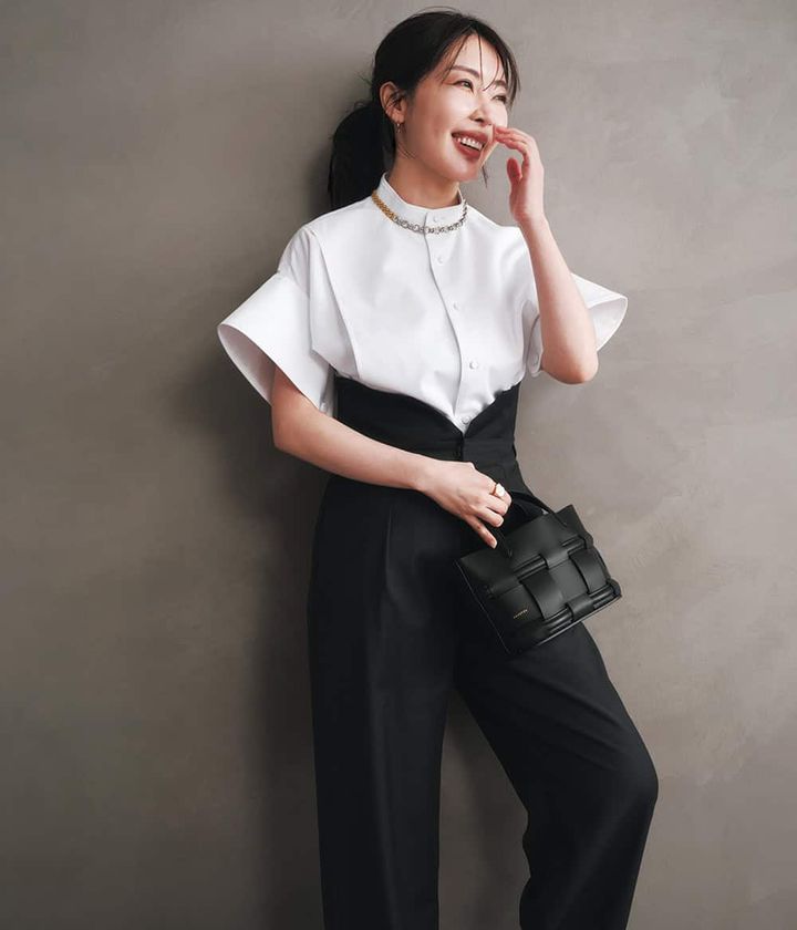「甘ブラウス=ふんわりやわらか」のイメージを一蹴、甘さは残しつつメンズのシャツのようなハリっとした素材にシフトし、カッコ良さを足して。甘ブラウスはシャツ素材にシフト。パンツは10㎝は盛れる超ハイウエスト!大胆なハイウエストとシャープなカッティングでウエストがどこにあっても高めに見せてくれます。