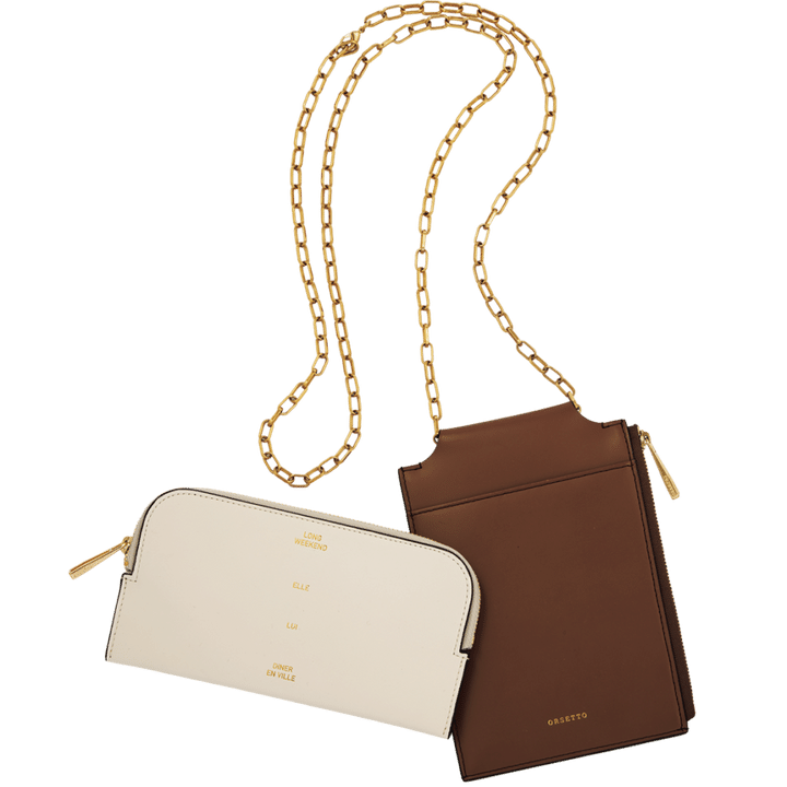 左:フラグメントケース[H8.5×W15.5㎝]¥19,800、右:チェーン付きフラグメントケース[H18×W12㎝]¥26,400(共にオルセット/オルサ)