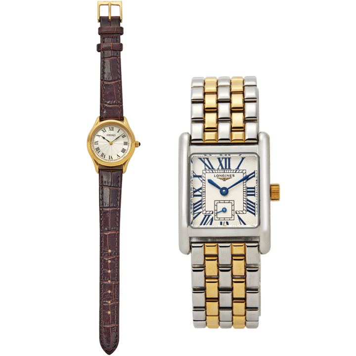 左:時計[ハードレックス×皮革(カーフ)]¥25,300(セイコーセレクション/セイコーウオッチお客様相談室)、時計右:[ステンレスティール×K18YG製キャップ]¥810,700(ロンジン/スウォッチ グループ ジャパン)