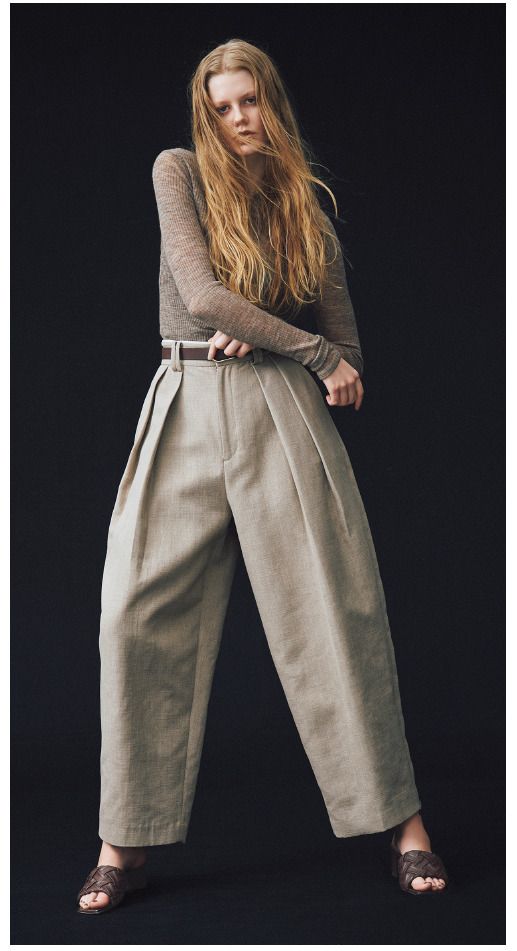 極端なカーブフォルムで引き立つミニマルな上半身が、くびれや華奢見えをアシスト。メリハリの効いたシルエットを意識すれば、肌見せやスカートに頼らずとも女らしさは演出可能。華奢なパーツを部分的に効かせた「パンツなのに色香が出せる」名品。