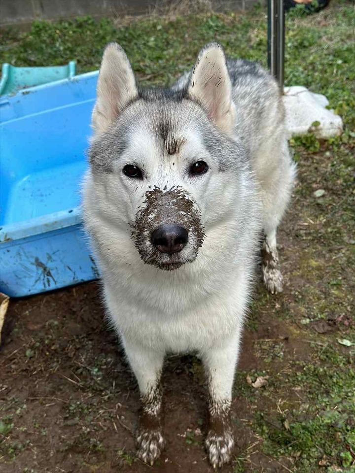 いっぱい遊んで泥まみれになったハスキー犬。「この後は風呂だよ」と伝えられるとその顔に「ですよね・・・って感じがたまりません」「えっ・・・みたいな顔がかわいい」