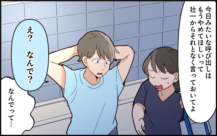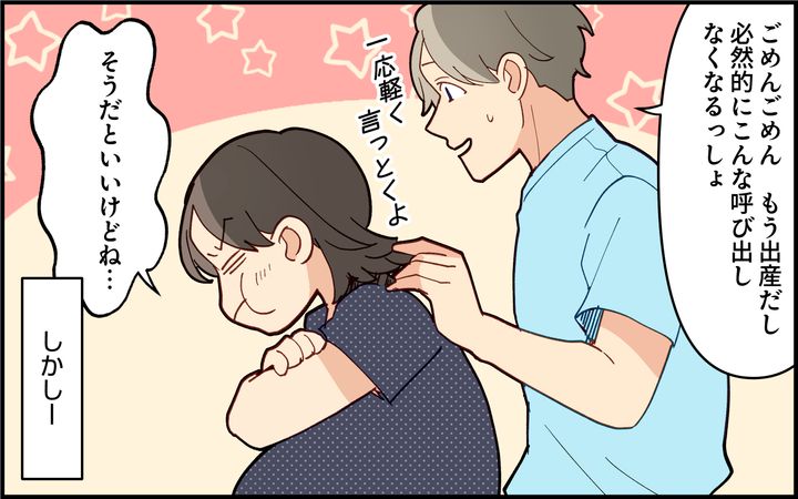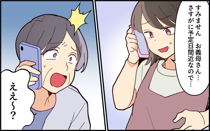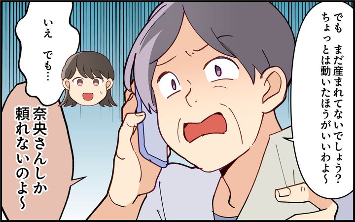 一家に一台って、私は便利家電じゃないんですけど。夫からそれとなくお義母さんにこういう呼び出しはやめてほしいと言ってもらおうと思ったんですが、「もうすぐ出産だからなくなるよ」とのんきな夫。その後、呼び出しはなくなるどころか、「まだ生まれてないんだから動いた方がいいわよ」と言われました。