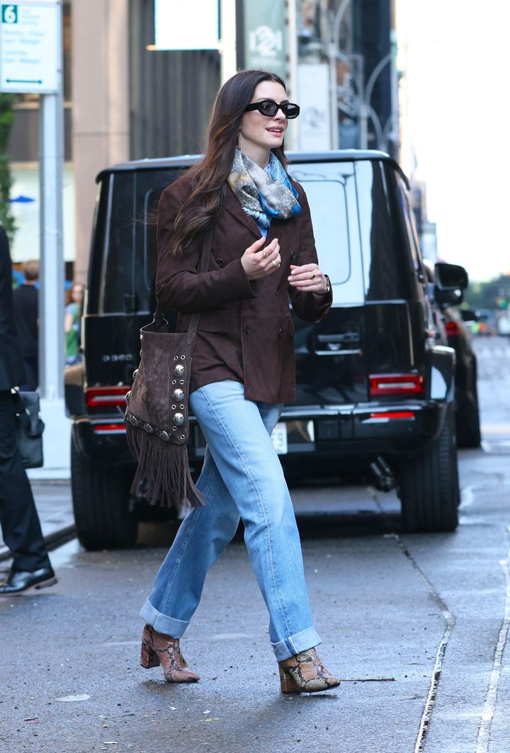 ラルフ ローレンのブレザーとヴァレンティノ ガラヴァーニのバッグはチョコレートブラウンのスエードで揃え、色落ちしたデニムにスネーク柄のブーツ、シルクのスカーフ、黒のサングラスでまとめたアン。大人の余裕を感じさせるルックだ。
