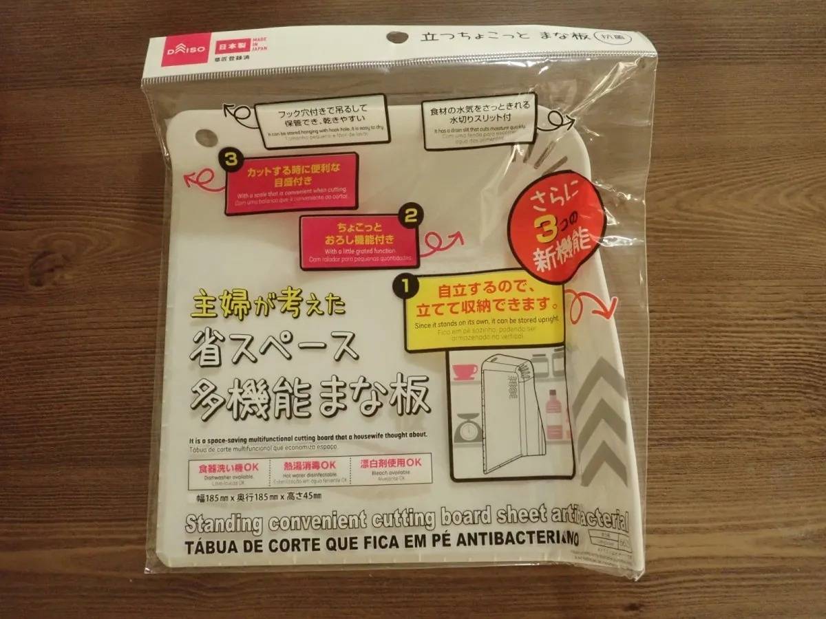 DAISO(ダイソー)の「立つちょこっとまな板「抗菌」」は、立てて収納できる、コンパクトなまな板です。