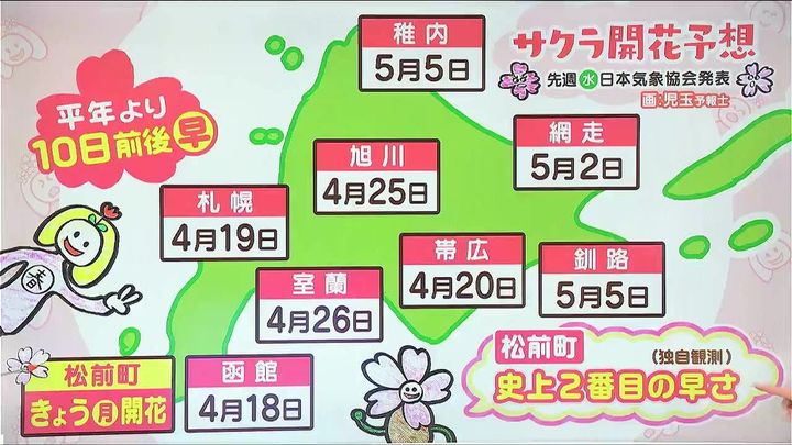 松前町はきょう13日(月)午後、開花しました。独自観測で史上2番目の早さでした。きょう13日(月)午前は青森で開花したので、半日で津軽海峡を渡ったことになります。平均だと、津軽海峡を桜前線が渡るのに4~5日かかるので、半日というのは異例のことです。日本気象協会の開花予想によると、函館は18日の土曜、札幌は19日の日曜で、今週末に開花しそうです。帯広は20日で来週月曜です。平年より10日前後も早く、記録的に早い開花になりそうです。