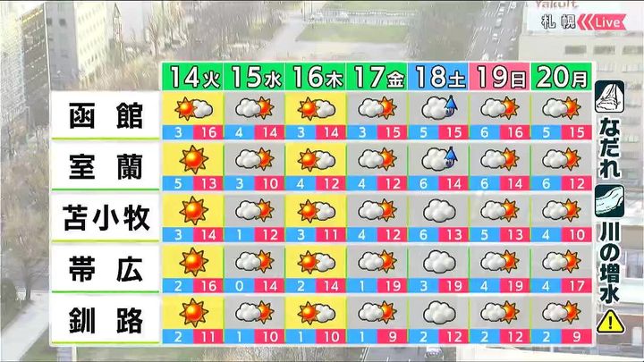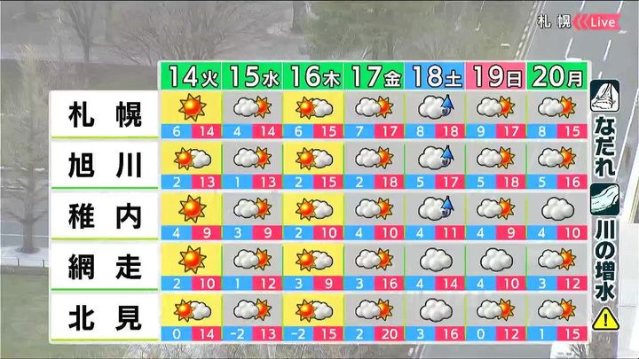 晴れ間の出る日が多いでしょう。札幌や旭川は木曜日以降、最高気温は15度以上ですが、傾斜地でのなだれや川の増水などに注意して下さい。