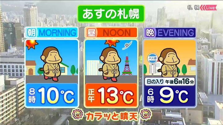 あす14日(火)の札幌です!朝昼晩の天気をもんすけでお伝えします!