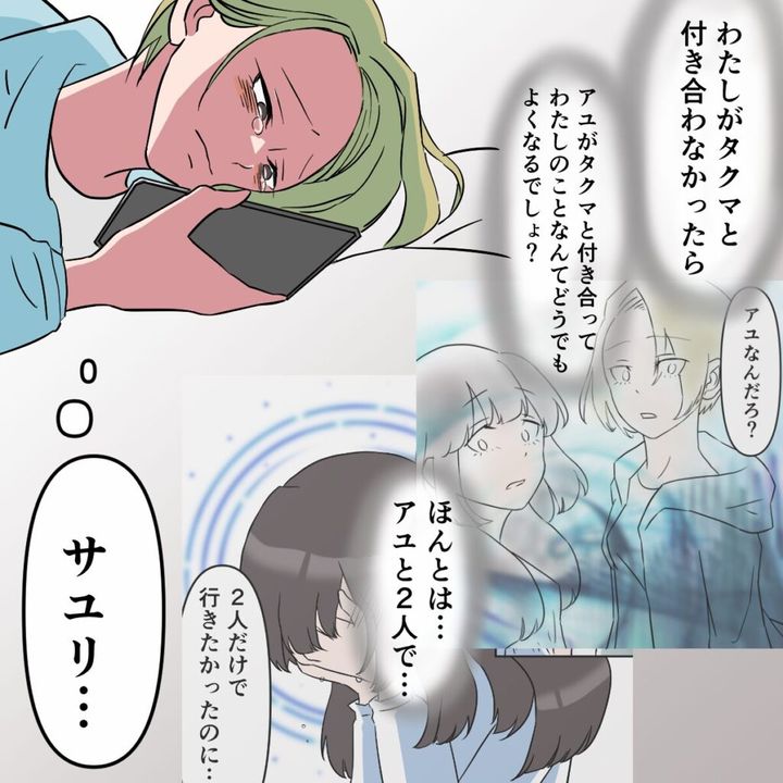 私とタクマさんが付き合うのを避けるために、好きでもないタクマさんと恋人になったサユリ。私の気持ちを知ったうえでタクマさんとの関係を邪魔していたと聞き、言葉を失ってしまいました。するとサユリは、「私がタクマと付き合わなかったら、きっとアユは私のことなんてどうでもよくなる」と泣きながら言いました。
