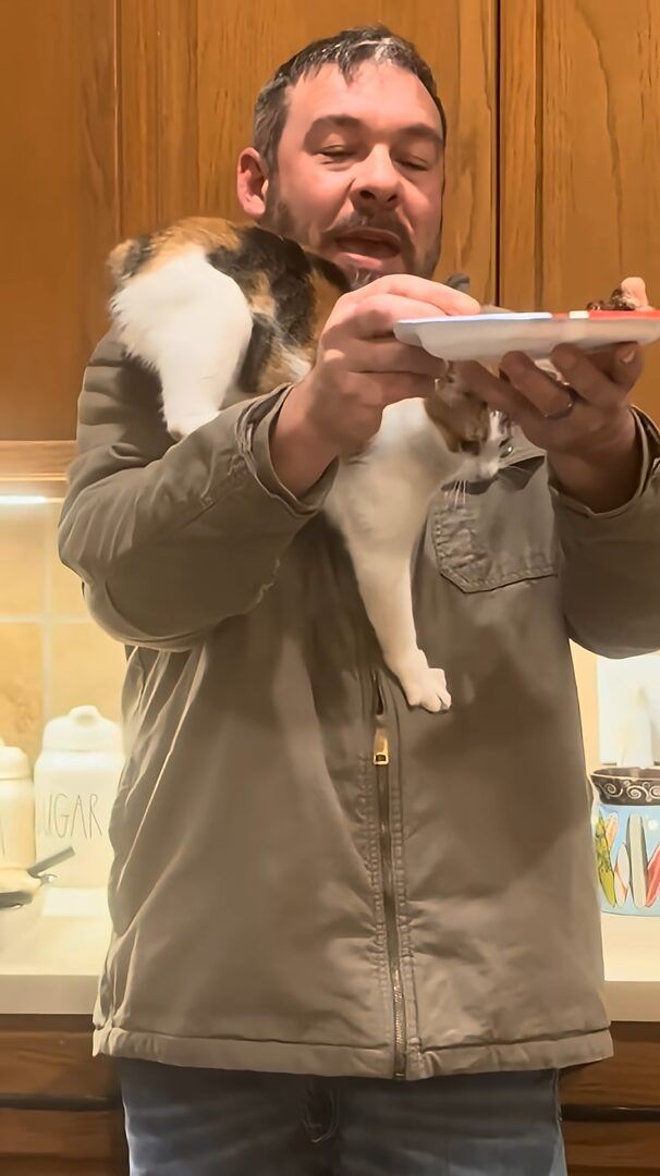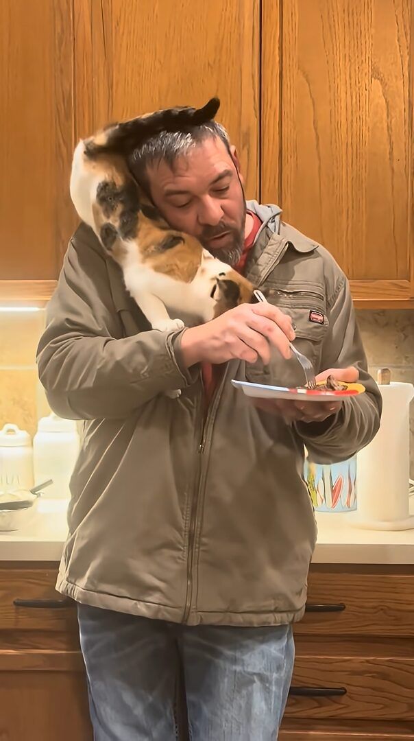 しまいには、お皿の前までやって来たネコ。 そんなおねだりをしてくるネコに対して、旦那さんはお皿を高く上げることで回避するのでした。 この子が、こうしてごはんのおこぼれを頂戴しようとするのは、もしかしたら日常茶飯事なのかもしれませんね~。