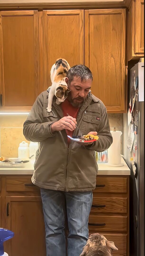 いつも立って食事をするという旦那さんにカメラを向けている撮影者さん。 食事中の旦那さんの肩には、ネコの姿がありますが・・・。
