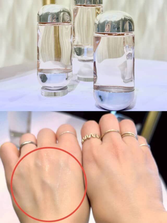 ▲イプサ ザ・タイムR アクア e(医薬部外品) 100mL:¥3,520(税込)、200mL:¥5,500(税込) ※価格は編集部調べ / (下画像)左側:塗布後、右側:塗布前